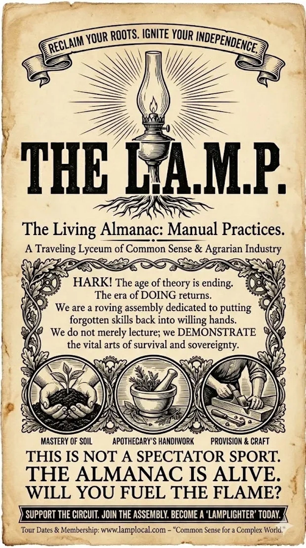 For 200 years, the Lyceum movement traveled the country to bring "Useful Knowledge" to every town square. Today, The L.A.M.P. (Living Almanac: Manual Practices) is reviving that 1826 spirit. We are assembling a local guild of master gardeners, herbalists, craftsmen, and "Old World" thinkers to bring the skills of self-reliance directly to your neighborhood.